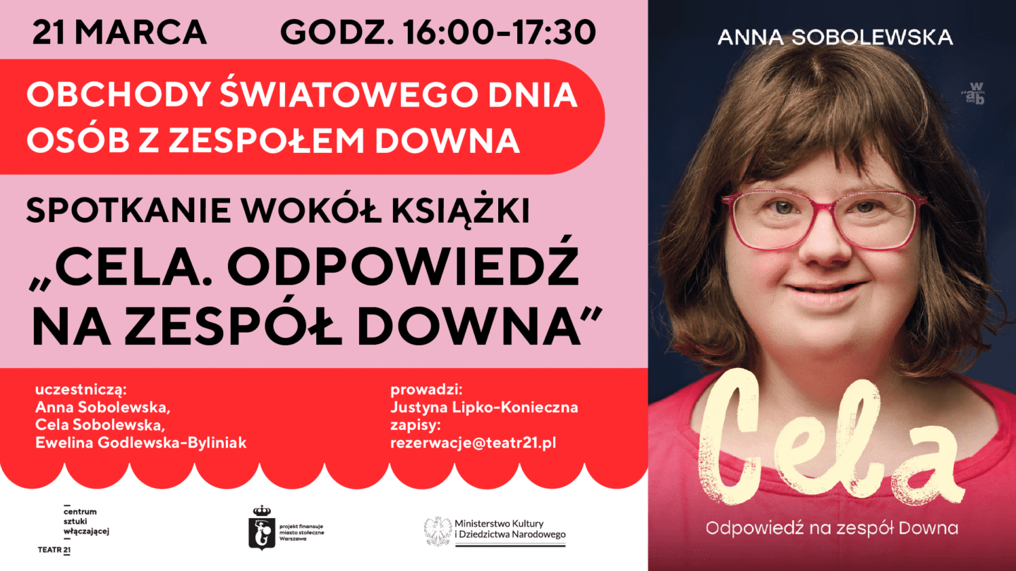 Centrum Sztuki Włączającej zaprasza na wyjątkowe spotkanie wokół książki „Cela. Odpowiedź na zespół Downa” autorstwa Anny Sobolewskiej, wznowionej po ponad dwudziestu latach przez wydawnictwo W.A.B. To poruszający zapis osobistych doświadczeń macierzyństwa w relacji dzieckiem z niepełnosprawnością, a zarazem ważna refleksja nad tym, jak jako społeczeństwo – w naszych codziennych praktykach, gestach i sposobach myślenia – reagujemy na inność. Książka otwiera także przestrzeń do wspólnego namysłu nad tym, jak budować bardziej włączającą rzeczywistość, w której osoby z zespołem Downa mogłyby w pełni uczestniczyć.